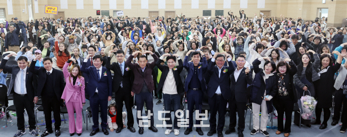2일 전남 장흥군 장흥통합의학컨벤션센터에서 ‘2024 전라남도 다문화 박람회’ 개회식이 열린 가운데 김대중 전남도교육감과 남도일보 김선남 부회장·박준일 사장, 강성휘 전남도사회서비스원 원장, 도내 22개 시·군 다문화 가족 등이 기념촬영을 하고 있다. /임문철 기자 35mm@namdonews.com