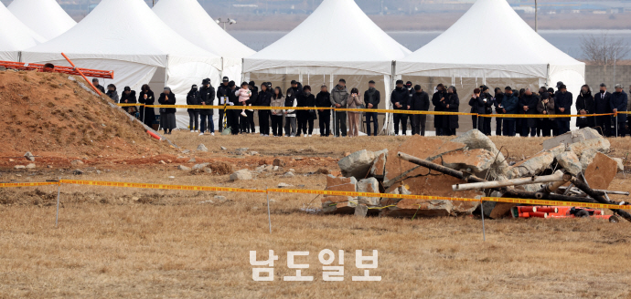 18일 전남 무안국제공항에서 ‘12.29 제주항공 여객기 참사 희생자 합동 추모제’가 열린 가운데 추모제가 끝난 뒤 유가족들이 참사 현장을 찾아 희생자들을 애도하고 있다. 태국 방콕에서 출발해 무안공항으로 향하던 제주항공 7C2216편은 지난달 29일 오전 9시 3분께 랜딩기어(비행기 바퀴)가 펼쳐지지 않은 상태에서 무안공항 활주로에 동체 착륙을 시도하다가 공항 시설물과 충돌해 기체 대부분이 화염에 휩싸이는 사고를 당했다. 179명이 숨지고 2명이 다친 제주항공 여객기 참사는 국내에서 발생한 항공기 사고 중 가장 많은 인명피해를 낸 최악의 항공 참사로 남게 됐다. 무안/임문철 기자 35mm@namdonews.com