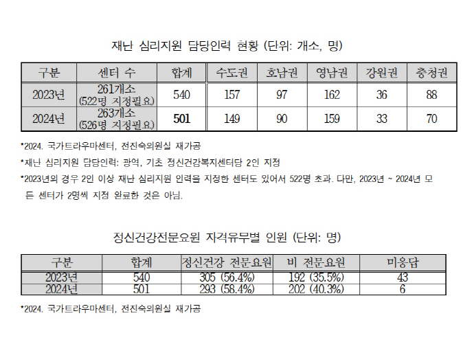 6일 국회 12·29 여객기 참사 진상규명과 피해자 및 유가족의 피해구제를 위한 특별위원회 소속 더불어민주당 전진숙 의원(광주 북구을)에 국가트라우마센터가 제출한 ‘정신건강복지센터 재난 심리지원 담당인력 현황’에 따르면, 2023년 재난 심리지원 담당인력 540명에서 지난해 501명으로 줄어든 것으로 나타났다.