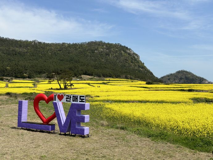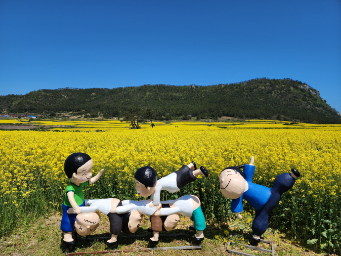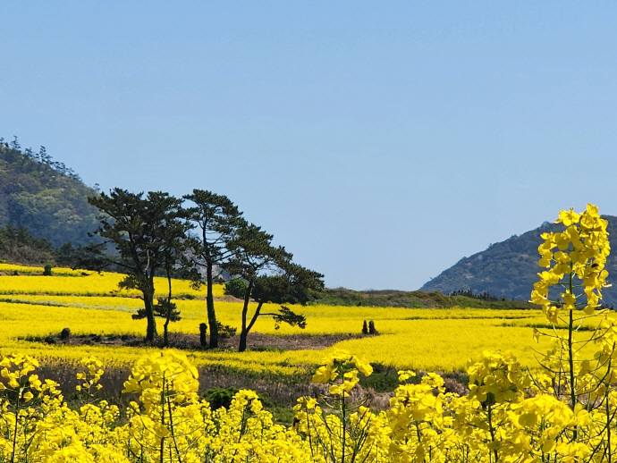 특히 약 7만 5천여 평 규모의 대단지 유채꽃밭이 노란 물결처럼 관광객을 맞이하고, 바람결을 따라 일렁이는 풍경은 섬 특유의 고즈넉한 분위기와 어우러져 마치 한 폭의 그림 같은 장관을 이룬다.