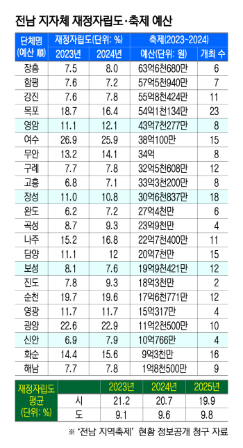 2023년 기준 전남 평균 재정자립도는 시 지역 21.2%, 군 지역은 9.1% 수준이다. 2024년 역시 각각 20.7%, 9.6%이다. 군 단위 지자체들은 대부분 세수 기반이 취약한 상황이지만, 수억에서 수십억원의 예산을 축제에 투입하고 있다.