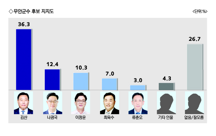 8일 남도일보가 ㈜리얼미터에 의뢰해 지난 4~5일 무안군에 거주하는 만 18세 이상 남녀 810명을 대상으로 여론조사를 실시한 결과, 내년 무안군수 선거 후보 지지도 조사에서 36.3%를 얻은 김산 현 무안군수가 여러 후보들을 제치고 1위를 차지했다. 다음으로 나광국 전남도의원이 12.4%, 이정운 전 무안군의회 의장이 10.3%, 최옥수 전 무안군 산림조합장이 7.0%, 류춘오 무안군체육회장이 3.0%로 뒤를 이었다.