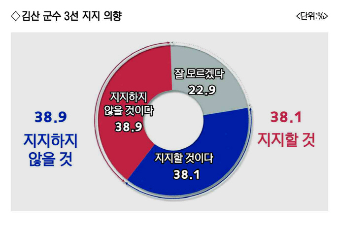 김 군수의 3선 도전 시 지지 의향은 팽팽하게 갈렸다. ‘지지할 것’은 38.1%, ‘지지하지 않을 것’은 38.9%로 격차는 0.8%p에 불과했다. ‘잘모르겠다’는 부동층도 22.9%에 달해 향후 무안국제공항 재개항과 군공항 이전 등 지역 최대 현안의 향배에 따라 이들 부동층 표심이 김 군수의 운명을 결정할 것으로 보인다.