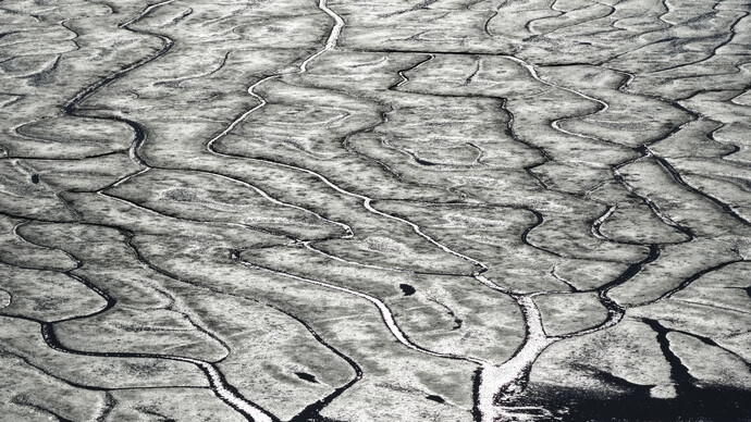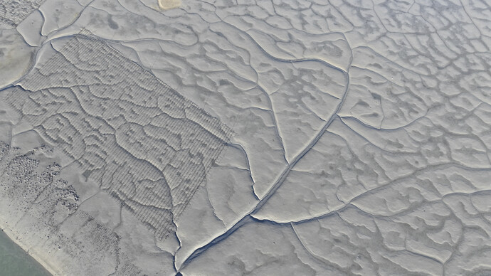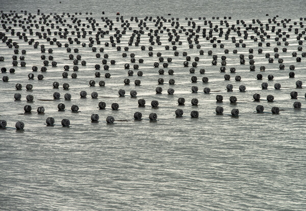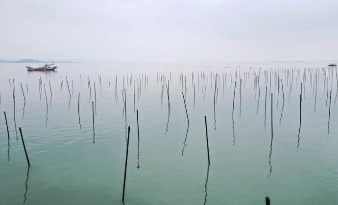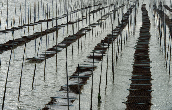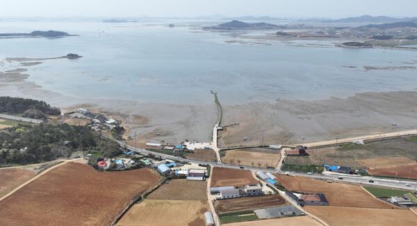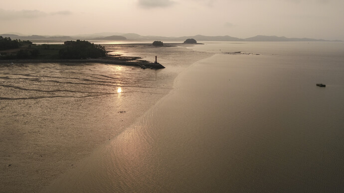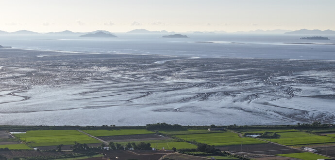 사진에서 지주식 김 양식장이 보인다. 무안은 전남 지역의 주요 김 생산지 중 하나다. 황토 갯벌의 미세한 입자와 풍부한 영양염류는 김 양식에 좋은 조건을 제공한다. 특히 무안 김은 색이 진하고 맛이 깊어 고급 김으로 평가받고 있다.