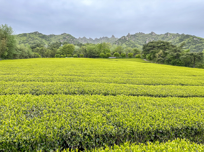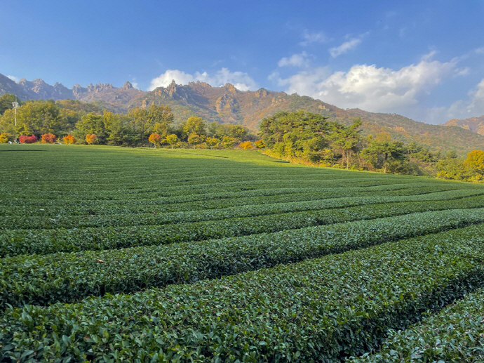 월출산 남쪽 자락 강진 성전면에는 완만한 구릉 위로 펼쳐진 다원이 있다. 이곳은 보성의 급경사 녹차밭과는 달리, 초록 물결이 차분히 춤추는 풍경화 같은 모습이다. 급경사 녹차밭과는 또 다른 여유가 느껴진다. 차나무밭 너머로 월출산 봉우리들이 어우러져 사계절 다른 얼굴을 보여준다. 봄의 생명력, 여름의 짙은 녹음, 가을의 깊은 빛깔, 겨울의 고요함이 차분한 산세와 함께 마음을 비치는 거울이 된다.