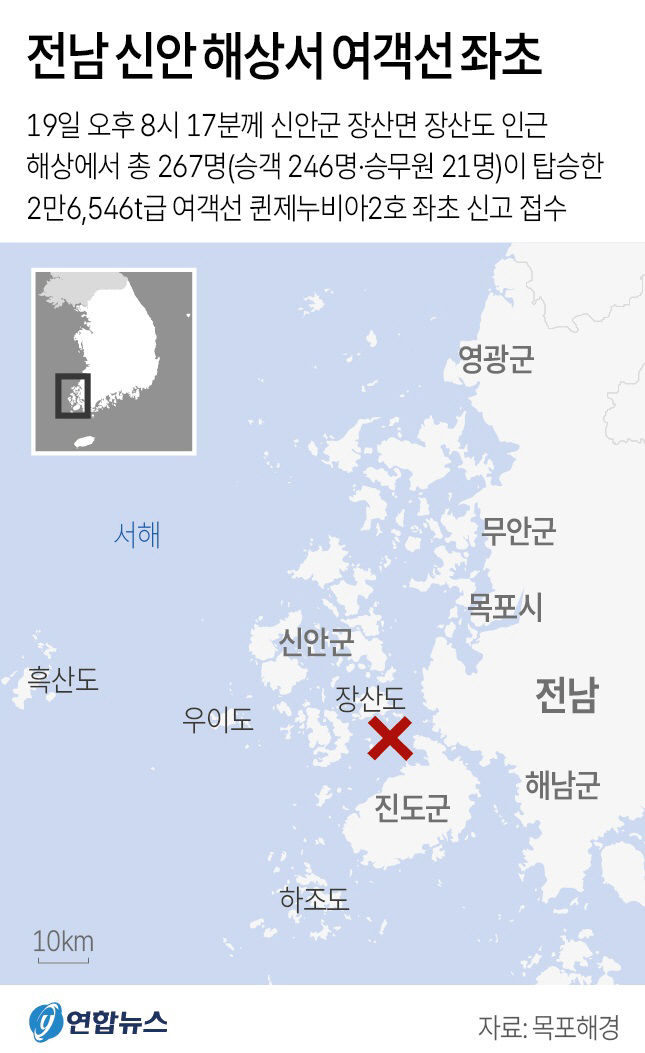 지난 19일 오후 8시 17분께 신안군 장산면 장산도 남방 족도에 여객선 ‘퀸제누비아2호’(2만6천546t급)가 좌초했다는 신고가 접수됐다. 퀸제누비아2호는 승객 246명과 승무원 21명 등 총 267명을 태우고 당일 오후 4시 45분께 제주에서 출발, 오후 9시께 목포항에 도착 예정이었다.